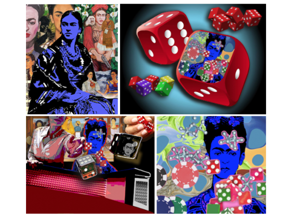 • A colorful mural of sunflowers and various faces are set before a rainbow.
